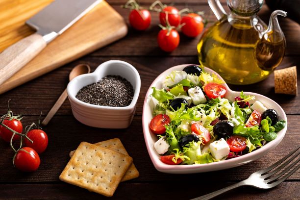 What decisions can we make to reduce our chances of developing heart disease? We can start by changing our eating habits. Heart-healthy diets contain lower amounts of cholesterol-containing foods and saturated fat. There are many examples of heart-healthy diets, such as a Mediterranean diet. Heart-healthy diets are low in complex carbohydrates and processed sugar. These components are particularly damaging for people with diabetes and/or who are overweight. Alcohol is a type of carbohydrate that contains a high quantity of calories. It is recommended that drinking alcohol-containing beverages should be done only in moderation. Also, the amount we eat, as measured by calories, plays a role in the creation and maintenance of a healthy diet.