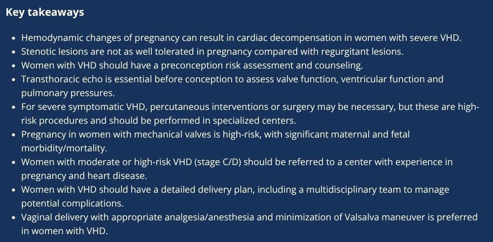 The presentation concluded with key takeaways on VHD in pregnancy, which are provided here.