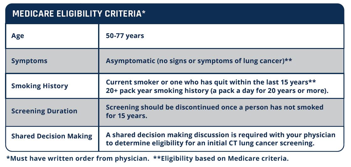 For non-Medicare patients, similar criteria will most likely be used by insurance providers to determine eligibility. Patients must have a written order from a physician to receive a lung cancer screening using CT.